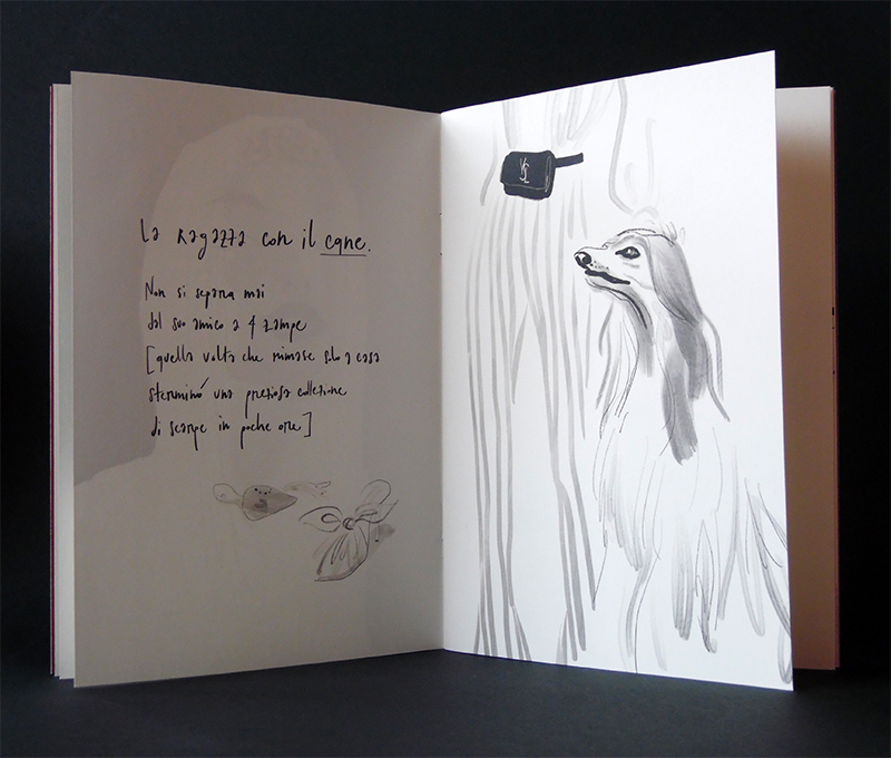 This limited edition art print book tells a short story that takes place during a Xmas Party. Text is handwritten in italian.